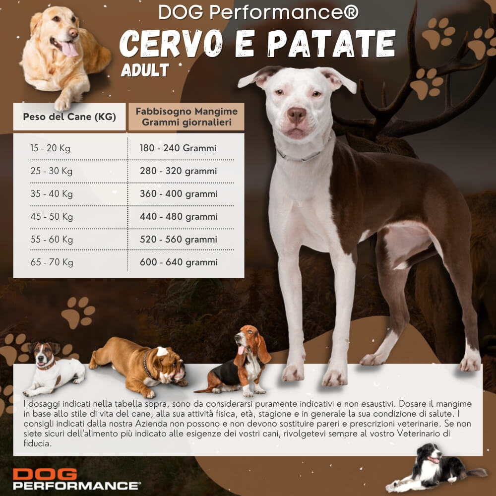 Le crocchette per cani Super Premium DOG Performance® Super Premium Adult con Cervo e Patate, sono un mangime MONOPROTEICO completo di alta qualità, prodotto con materie di prima scelta che soddisfa ottimamente i fabbisogni nutritivi di cani appartenenti a qualsiasi razza ed età. Le materie prime impiegate sono selezionate in base alle caratteristiche nutritive intrinseche e alla loro freschezza in modo tale che conferiscano al prodotto un elevato grado di appetibilità. Questa formula è stata appositamente studiata per soddisfare il fabbisogno nutritivo dei cani adulti, con aggiunta di lievito di birra e yucca schidigera per migliorare l’assimilazione a livello intestinale con azione prebiotica. Adult con Cervo e Patate, è un mangime monoproteico indicato per prevenire intolleranze e allergie causate dall'intolleranza ad altre proteine animali, nei cani di qualsiasi razze ed età. Ricco di fonti naturali di Omega 3 e Omega 6, apporta vitamina C e vitamina E ad azione antiossidante e lievito di birra fonte naturale di vitamine del complesso B.